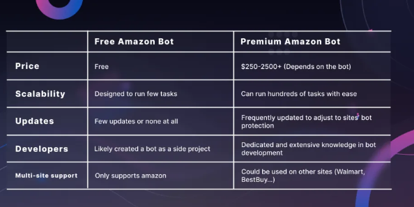 - Most free Amazon buy bots don’t push frequent updates (or any at all). That may not seem like a problem, but Amazon constantly updates its site and bot protection. So while the free option could work initially, its performance severely deteriorates as it becomes more outdated.